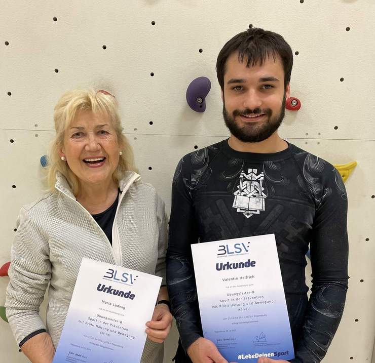 Im November 2025 haben unsere zwei Übungsleiter Maria Ludwig (Fitness-, Wander- und Seniorensportabteilung) und Valentin Helfrich (HEMA-Abteilung) beim BLSV die Lizenz „Übungsleiter-B - Sport in der Prävention mit Profil Haltung und Bewegung“ abgelegt.