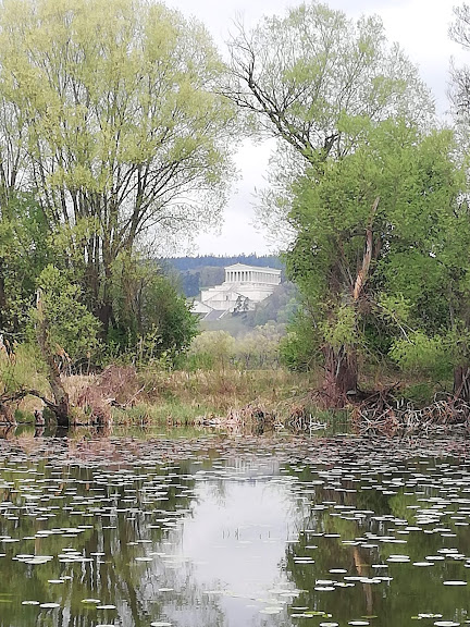Wäldchen, Bächen und Nasswiesen. Besonders beeindruckend waren der Renngraben und die Rinsen, einem See unterhalb von Sarching, der seine Entstehung, wie der Renngraben auch, einem alten Donaulauf verdankt. Von einem Podest in der Rinsen aus genossen wir den schönen Ausblick bis zur Wallhalla. Im Renngraben entdeckten wir eine Biberburg, dazu mehrere Biberausstiege, die zu Fraßstellen in angrenzenden Feldern führten. Aber auch im künstlich angelegten Friesheimer Ableiter war zum Erstaunen der Biber aktiv, was ein Biberdamm im Bach und beginnender Fraß in Maisäckern verriet.
