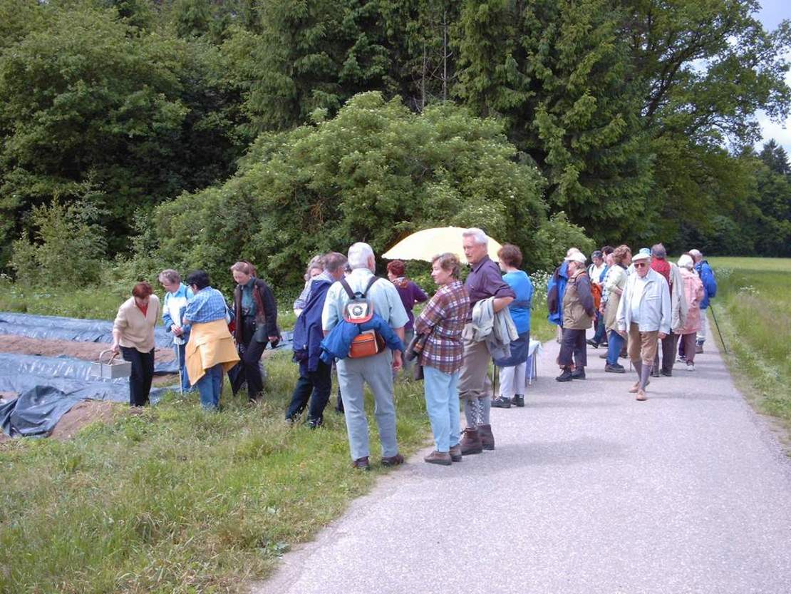 Beim Durchwandern des folgenden Waldes haben wir dann alle vor lauter Quatschen einen markierten Abzweig verpasst, was in der Folge einen "Umweg" von ca. 60m zur Folge hatte und uns über einen Hof auf dem Weg nach Tremelhausen führte. Hier gabs dann ein Gruppenfoto neben einer rießigen Eiche mit dem Adlersberg im Hintergrund, sodass wir die 60 Mehrmeter nicht umsonst gemacht hatten, was aber eh egal gewesen wäre bei dem tollen Wetter und mit genug Reserven im Zeitplan. Alle Wanderer (Respekt, Respekt!) nahmen dann beim Adlersberg den markierten, aber steileren Anstieg über die Wiese zum Prösslbräu, wo wir die in der Gaststube reservierten Plätze nicht in Anspruch nahmen, weils im Biergarten optimal angenehm war. Hier stießen auch noch 2 Nachfahrer zur Gruppe, weil ja neben dem Wandern auch die Kommunikation wichtiger Bestandteil unserer monatlichen Wanderungen ist.